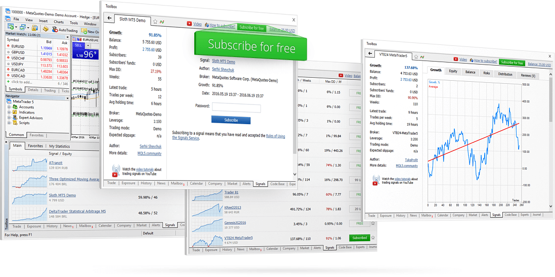 No time for manual trading or analyzing the markets? That's not a problem: subscribe to a signal of a successful trader, and MetaTrader 5 will automatically reproduce all his trades on your account. Choose from hundreds of free and paid signals available for demo or live accounts with the preferred risk level and profitability. Subscribe to the selected signal provider in just a few clicks, and your platform will trade automatically for you. You may choose to monitor trading results or completely rely on the signal behavior.