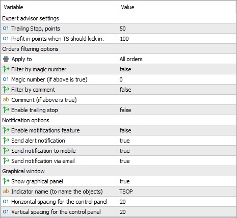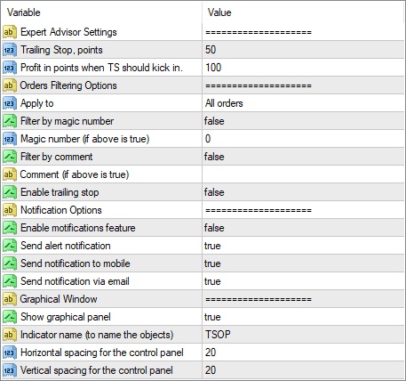 - Enable Trailing Stop — if true, the EA is active and is trailing stop-losses.